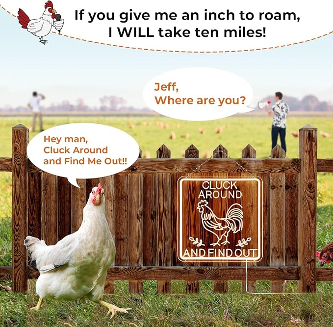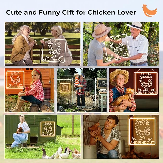 - 【Chicken Gift for Chicken Lover】It’s a rooster decor for people who love chicken,Create a humorous light and a nice light atmosphere for your chicken coop. If you don't understand what CLUCK AROUND AND FIND OUT.Ask your friends who have chicken, it's a very funny phenomenon in chicken keeping: if you give your chicken an inch to roam, they will take ten miles!