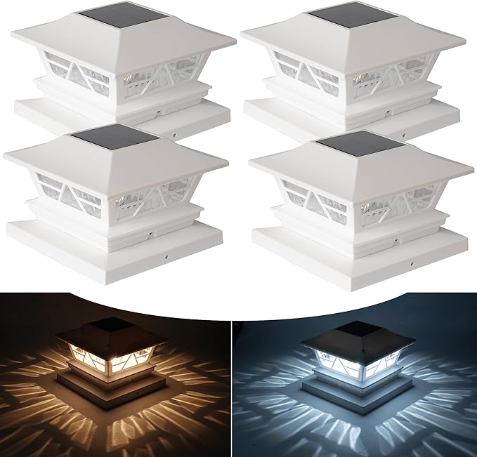 TW SHINE 4 Pack Solar Outdoor Fence Post Lights, 2 Modes Post Cap Lights Waterproof Warm White/Cool White for Yard, Garden, Porch, Patio Decor, for 4x4 5x5 6x6 Wood Posts, White