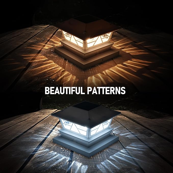 - Dual Color Options: These solar lights for deck posts feature two color modes, allowing you to choose between white and warm white. Equipped with LED beads, our solar-powered fence post lights emit a bright 15-lumen glow as dusk approaches, making them perfect for illuminating outdoor areas.