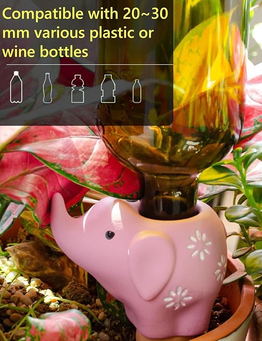- 🐘Easy to Use: Simply soak the terracotta in water, insert self-watering spikes into the soil, and fill it up. The wide opening makes refilling easy, and the automatic plant waterer gradually releases water into the soil, keeping your plants perfectly moist without overwatering.