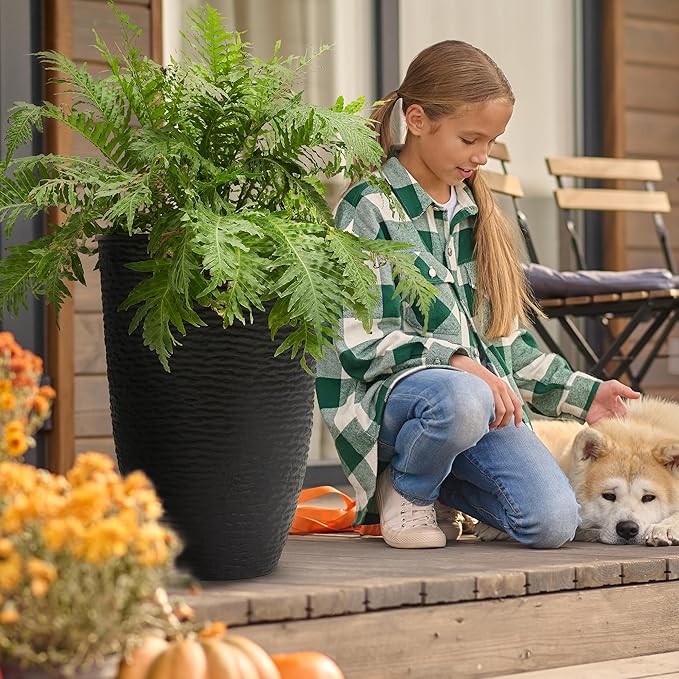 WORTH Garden 2-Pack 21" H. Black Tall Planters with Inside Pots - 14'' Dia Plastic Large Round Plant Tree Pots - Decorative Imitation Stone Finish for Indoor Outdoor Front Porch Container Patio