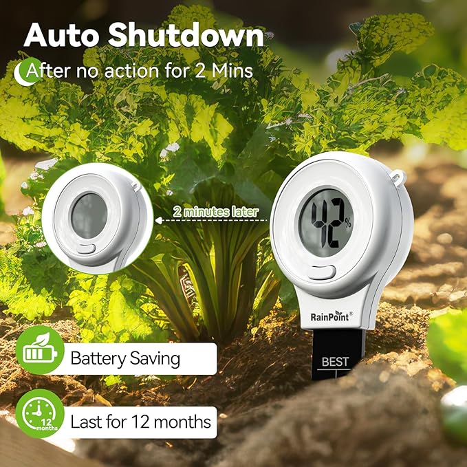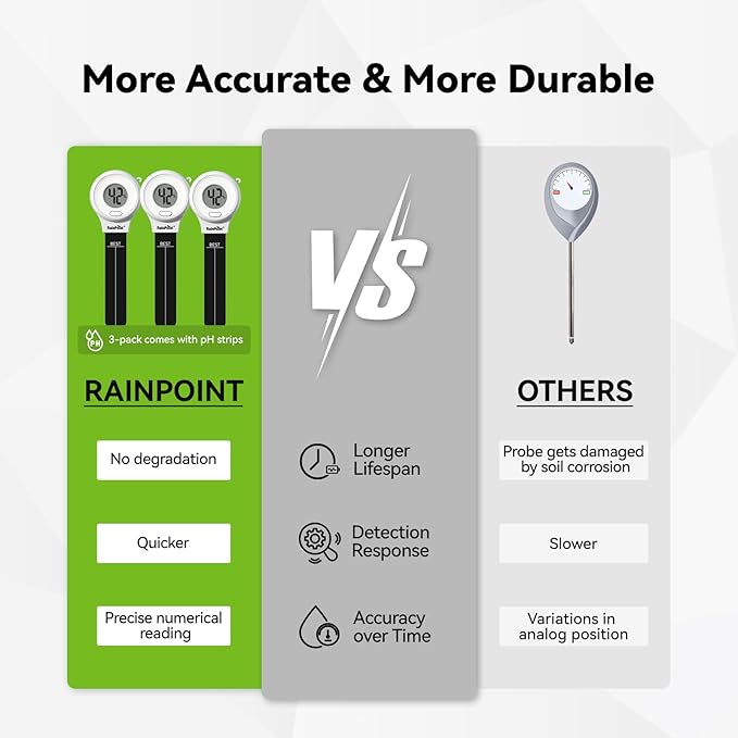 - 【Accurate & Reliable Measurement】 Equipped with the precision sensor, RainPoint soil meter delivers quicker and more accurate readings than traditional types, helping you assess soil moisture levels effectively. This ensures that your plants thrive by receiving adequate hydration without risking overwatering.