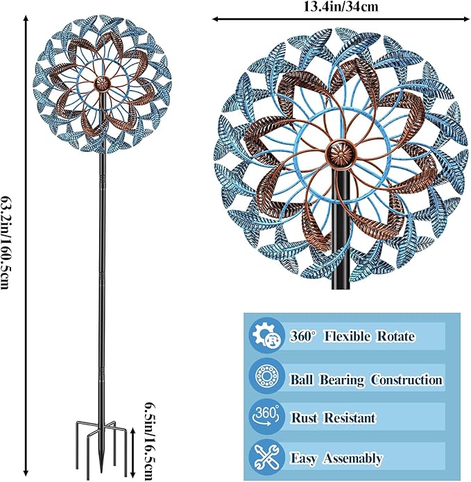 - Unique Kinetic Wind Spinner: Extra large 13.4" wide and 63.2" high, 4 tiers blades(2 large+ 2 small layer yard spinner). Dual sided rotating blades with dual direction wind motion, 4 tiers blades smoothly rotate in opposite directions on sealed bearings. and with its 360 degree rotation, adding a more dramatic look