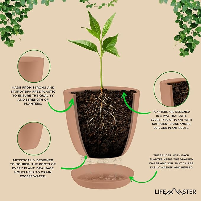 - UNIQUE DRAINAGE DESIGN: Lifemaster Planter Pots feature strategically placed drainage holes that prevent blockages and soil leakage, ensuring your plants have the optimal environment for healthy growth. The holes at the bottom promote excellent water drainage and aeration, keeping your plants' roots healthy and thriving.
