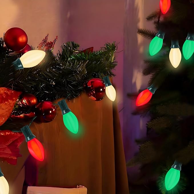 - Multicolor Outdoor Christmas Lights: Add vibrant holiday cheer with these 25FT C7 LED red, green, and white Christmas lights. The classic color combination brings a festive and traditional look to your Christmas tree, garlands, and outdoor displays. LED outdoor string lights perfer for decorating your home, store, backyard, garden, patio, wall, gate, yard, Christmas tree, window, party