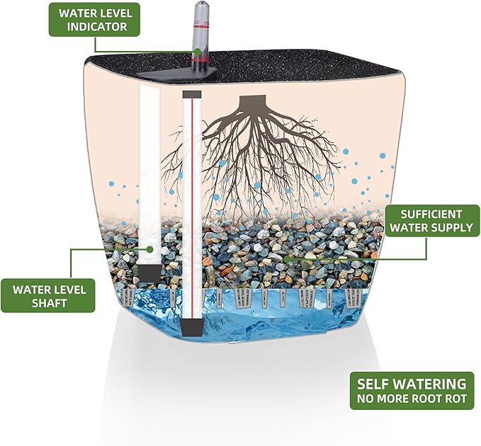 - SELF WATERING & NO MORE ROOT ROT - The smart unique sub-irrigation system is one of the most appealing aspects among all Dexceder planters. The easy-to-use separated integrated water reservoir or catcher- keeps your soil well aerated and automatic supplies plants with the right amount of ongoing moist air & nutrition for optimal growth. The insert indicator shows you the exact time to water again. The full water supply period can single-handedly last over 3 weeks based on different live plants