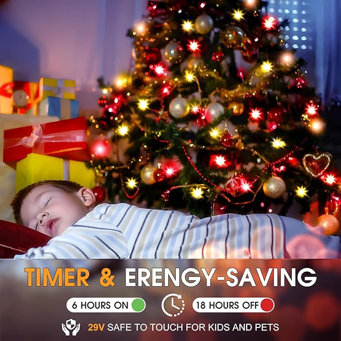 - Safer and More Efficient: Christmas LED Lights is powered by 29V low voltage output Plug with UL certified, and Low-temp LED bulbs ensure no overheat after long time using. Very safety for kids and pets even can hold it or hang it on their bodies. The LED beads not only do they consume a fraction of the energy , but they also boast a longer lifespan, saving your both energy and money in the long run. It's a win-win situation that combines eco-friendliness with cost-effectiveness.