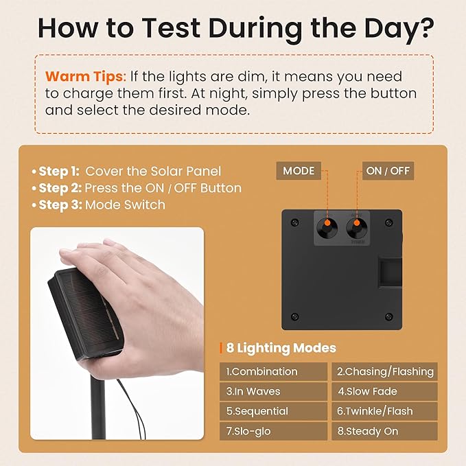 - Memory Function & Wide Application: These solar lights outdoor waterproof with built-in memory chip save the last modes setting and no need to reset mode every day. Perfect decoration for patio, garden, Christmas, holiday, wedding, party and other celebration occasions