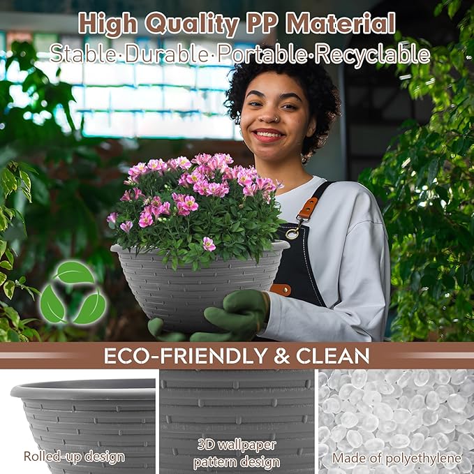 - 【Drainage Holes and tray】:Each 12 inch pots for plants features multiple drainage holes for effective water removal to protect plant roots from damage. This feature is vital for the well-being of your greenery, thereby keeping your plants healthy and thriving. (Plant saucers not included.)