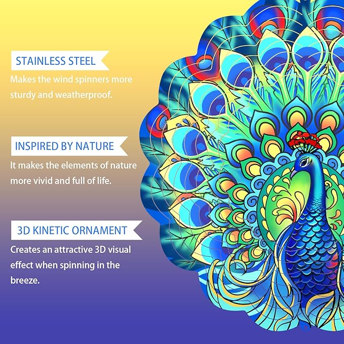 - 【3D Visual Effect】The peacock wind spinner adopts a colorful appearance, inspired by the animal image of a peacock in nature. The unique design of elements is combined with a 3D streamer effect, making it look more visual.