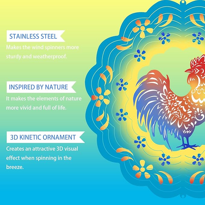- 【3D Visual Effect】The rooster wind spinner adopts a colorful appearance, inspired by the animal image of a rooster in nature. The unique design of elements is combined with a 3D streamer effect, making it look more visual.