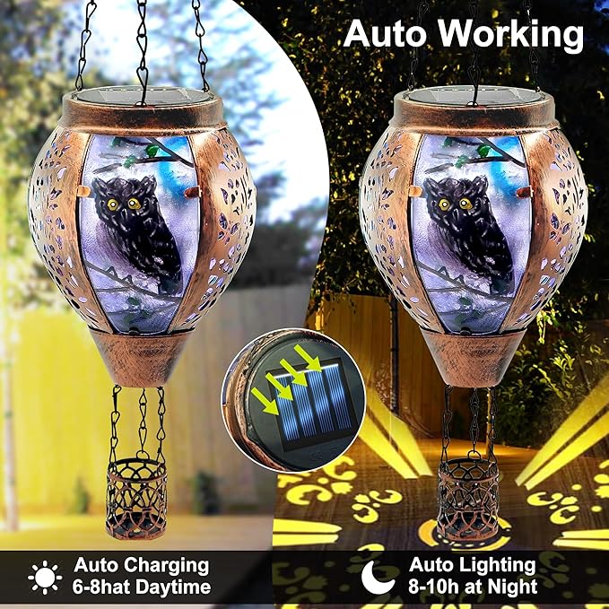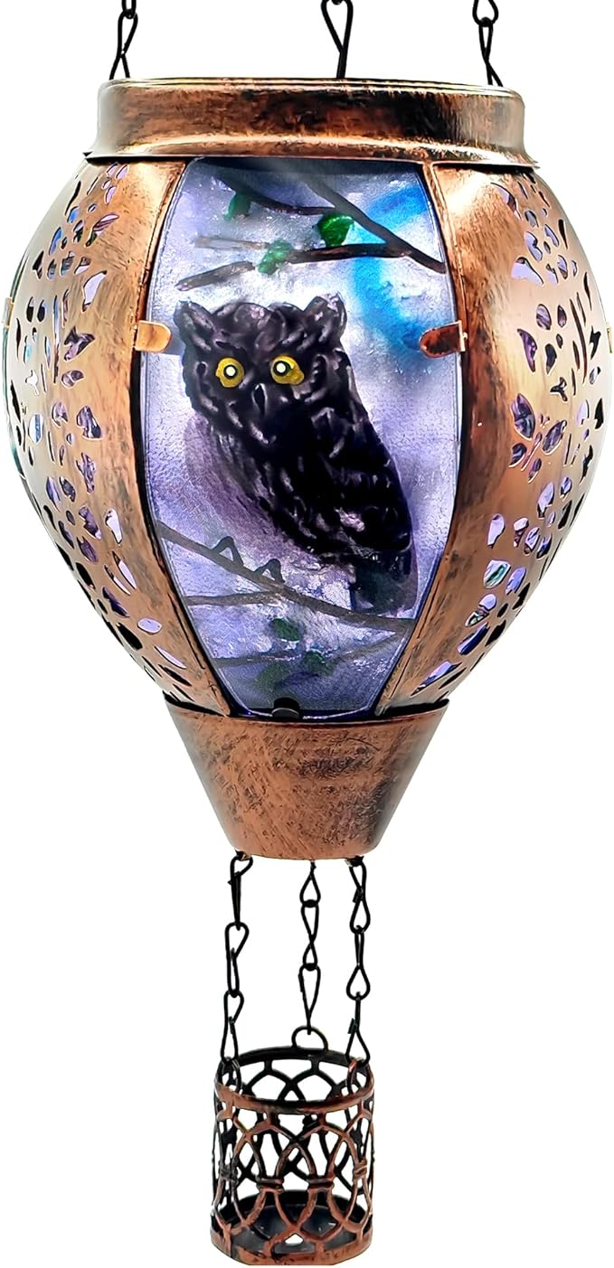 - 【Twilight Owl Solar Lantern Design】This hanging solar light is made of high quality metal (antique brass finish) and owl glass. The hot air balloon solar light is waterproof, not easy to break and deform, and has a long service life. When night falls, the metal with solid glass panels and warm white lights create a glow that adds warmth and coziness to your garden, patio, yard, pathway and more, great Christmas decorative light.