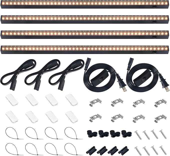 - What You Get: 4 x Barrina T5 Grow Lights, 2 x Power Cords with ON/OFF Switch, 3 x Connecting Cords (20''), 4 x Small Connectors, 8 x Installation Clips, 8 x Magnetic Bars with Double-Sided Tape, 8 x Cable Ties, 4 x Dustproof Cap