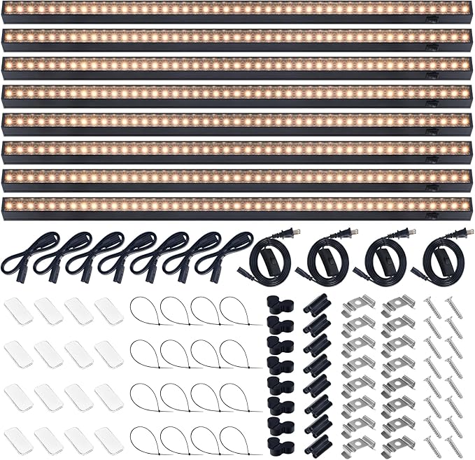 - What You Get: 8 x Barrina T5 Grow Lights, 4 x Power Cords with ON/OFF Switch, 7 x Connecting Cords (20''), 8 x Small Connectors, 16 x Installation Clips, 16 x Magnetic Bars with Double-Sided Tape, 16x Cable Ties, 8 x Dustproof Cap