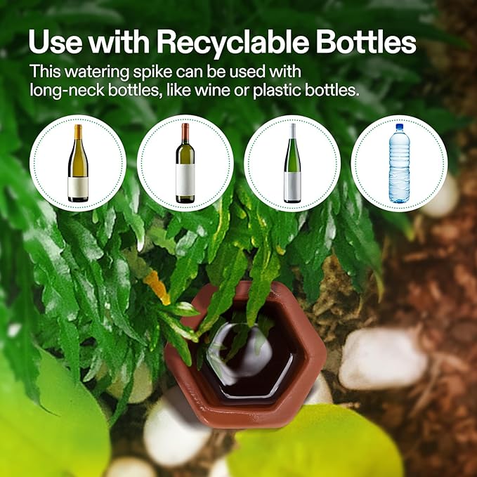 - Easy to Use: Soak the spike in water for 15 minutes, place it on top of a water-filled bottle, and insert it three-quarters deep into the soil for automatic watering; Compatible with long-neck bottles like wine or plastic bottles