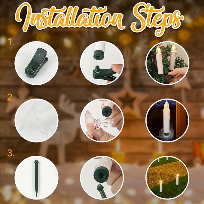 - [Multi-using Christmas Tree LED Candles]: 🌲A package includes a remote and 10 Christmas holiday candles, 10 clips to stuck in the Christmas tree, 10 suction cups to attach on the windows, 10 pentagram holders to sit on the tabletop, 10 plastic snags to stick in the grass