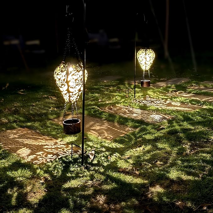 - 【Multiple Uses】This hot air balloon solar light can be hanging almost anywhere, such as from a tree, porch, or patio—ideal for adding a warm ambiance to your outdoor space. We also include a shepherd hook, allowing you to install the lantern in your lawn, backyard, flower bed, alongside a path, or even use it as a pathway light on your driveway or walkway. Perfect for both lighting and decoration.