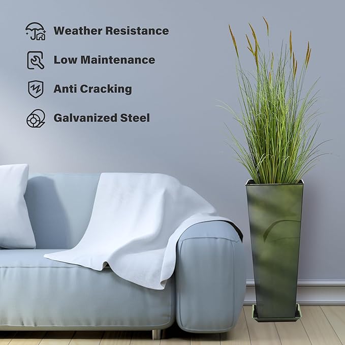 KOL 28''H. Tall Metal Planter with Saucer, Galvanized Steel Glazed Planter Pots with Drainage Hole for Indoor & Outdoor Use, Set of 2, Decorative Flower Plant Pots for Front Porch, Patio, Deck - Green
