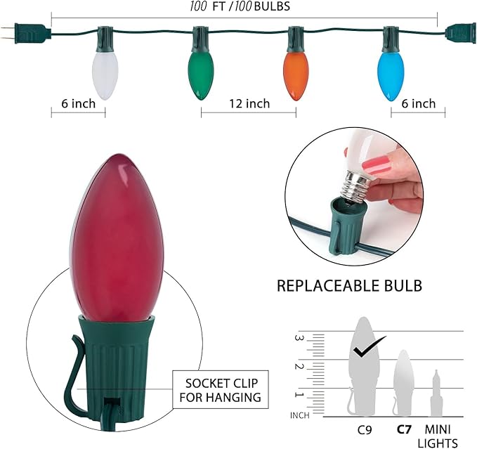- 100 feet long string with 100+4 spare clear C9 Bulbs. Not Connectable