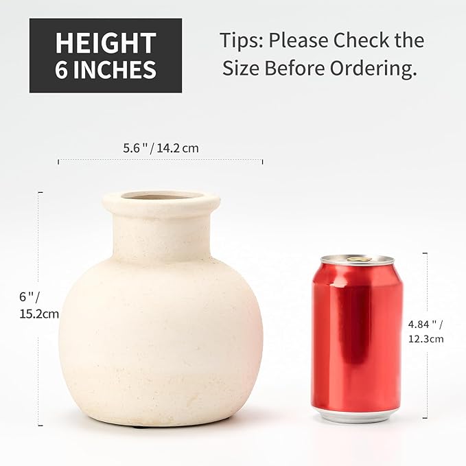- ๐๐๐๐ฌ๐ฎ๐ซ๐๐ฆ๐๐ง๐ญ๐ฌ: The rustic vase measures 6" height and 5.6" width with 2.4" opening.Perfect for greenery and dry or faux florals,but also can hold water for fresh flowers.The vase itself can be displayed indoors or outdoor as a fine decorative piece.