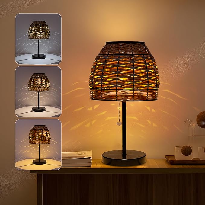 - Boho Rattan Table Lamps--The rattan shade of this table lamp is made of hand-woven, and its natural style blends perfectly into the patio decor, adding a natural feel to your garden. The boho chic solar table lamp is warm and elegant, and fits in with the bohemian/natural/nautical/seaside/coastal style of furniture.MAINLY FOR DECORATION, NOT FOR ILLUMINATION.
