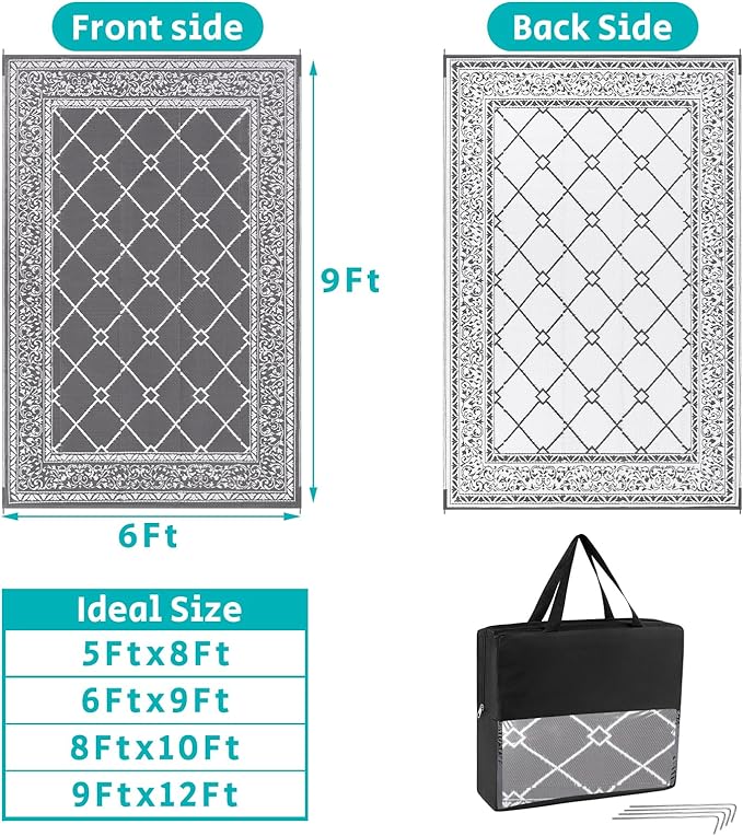 - Reversible Outdoor Rugs: Featuring a classic moroccan pattern on both sides, this 6x9 ft outdoor area rug allows you to instantly refresh your patio, porch, backyard, deck, RV campsite. And this outdoor deck rug is reversible, two-sided design allows you to have two different looks,both sides can blend perfectly with nature and look very full and comfortable.