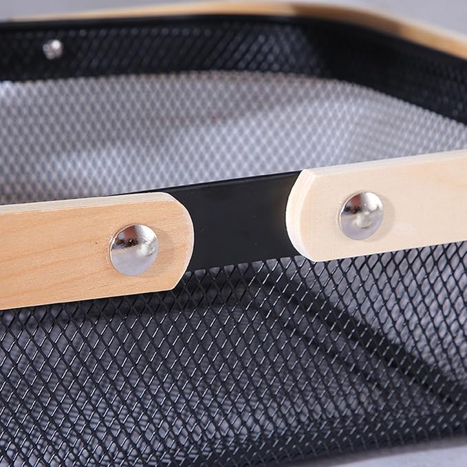 - The metal mesh storage organizer baskets bin with wooden handle is a great way to organize or decorate your home, office, apartment, lofts, or other living spaces. This wire basket also can be a fruit basket or garden basket and storing those fruits and vegetables outside the refrigerator. Also as extra storage to meet your needs for household use.