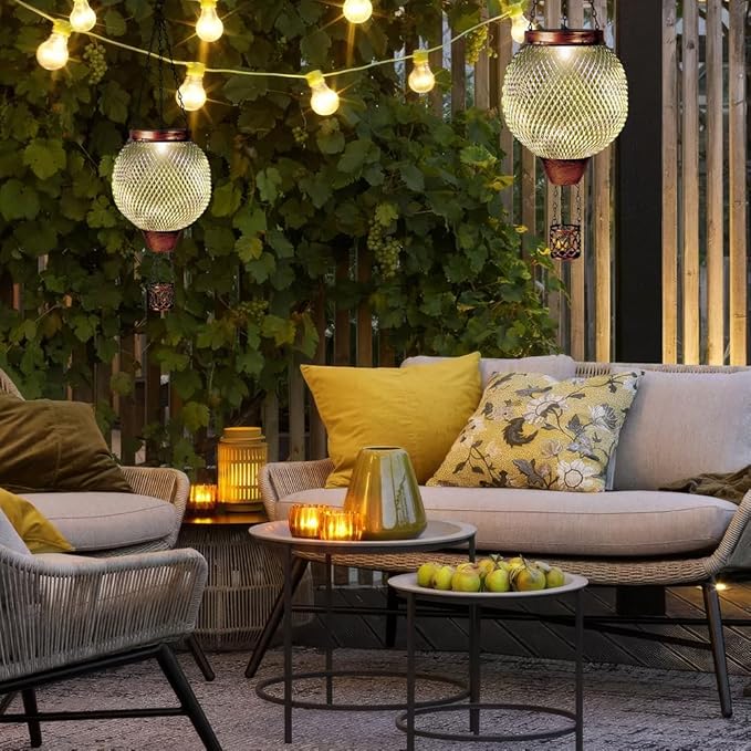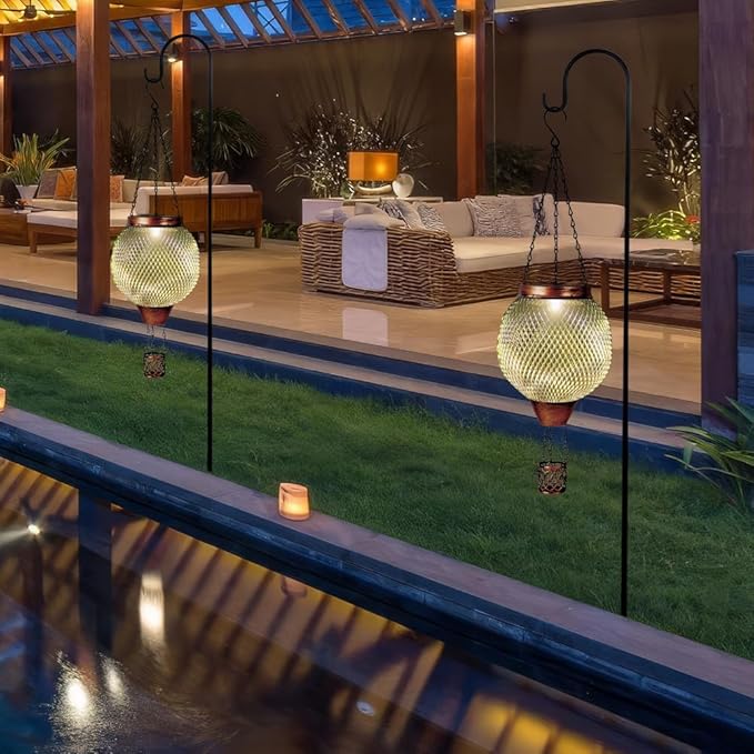 - 【Hot Air Balloon Solar Lantern】This outdoor hanging solar lanterns features a distinctive design with a metal mesh exterior that exudes a vintage charm. The cage shpe creates a delicate effect, allowing light to filter through and cast beautiful shadows.