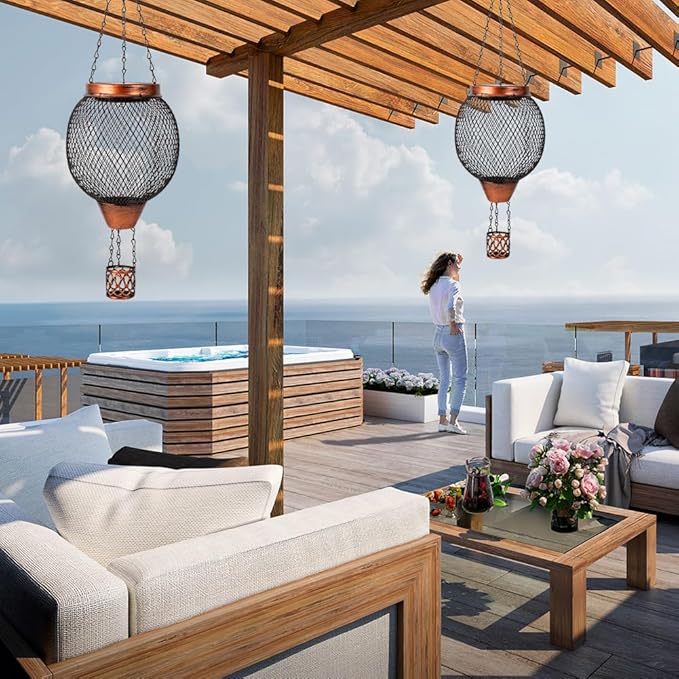 - 【Hot Air Balloon Solar Lantern】This outdoor hanging solar lanterns features a distinctive design with a metal mesh exterior that exudes a vintage charm. The cage shpe creates a delicate effect, allowing light to filter through and cast beautiful shadows.
