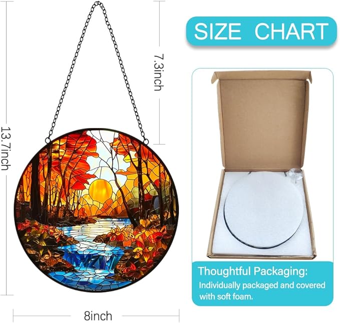 - Glass Window Decorations: The upgraded large-size glass hanging panels bring you a new decorative experience. This is a very beautiful sunset suncatchers, size is 8 inches which is perfect for any windows or wall space. Stained glass window hanging is the right size to enhance your home decor without blocking the view, it is a good choice for decorating a house