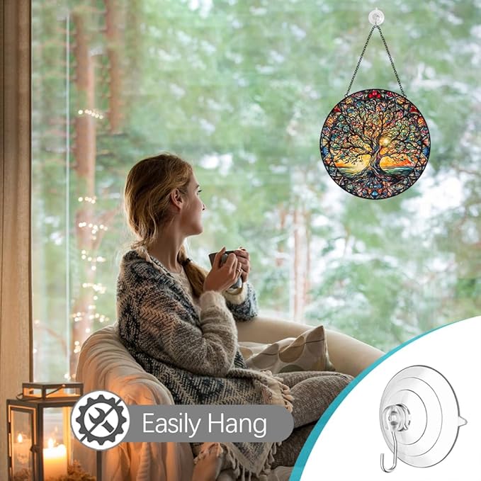- Glass Art Window Decorations: The upgraded large-size stained glass hanging panels bring you a new decorative experience. This is a very beautiful tree of life decor stained glass window hanging, size is 8 inches which is perfect for any windows, wall or garden space. Stain glass window hanging is the right size to enhance your home decor without blocking the view, it is a good choice for decorating a house