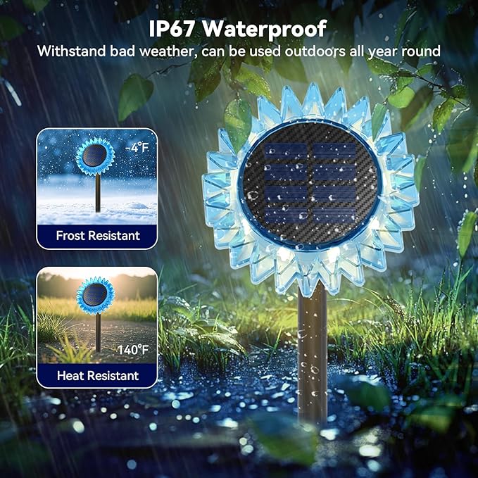 - Efficient Solar Charging & Long-Lasting Light: Sunflowers solar lights outdoor Features a larger, high-conversion solar panel and a 1000mAh rechargeable battery, charging in just 4-6 hours to provide 8-10 hours of beautiful illumination. Enjoy all-night lighting with no extra effort
