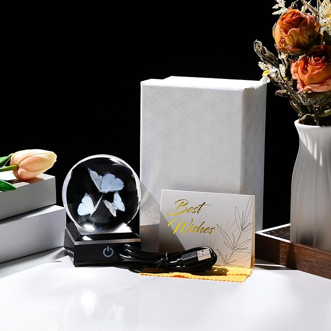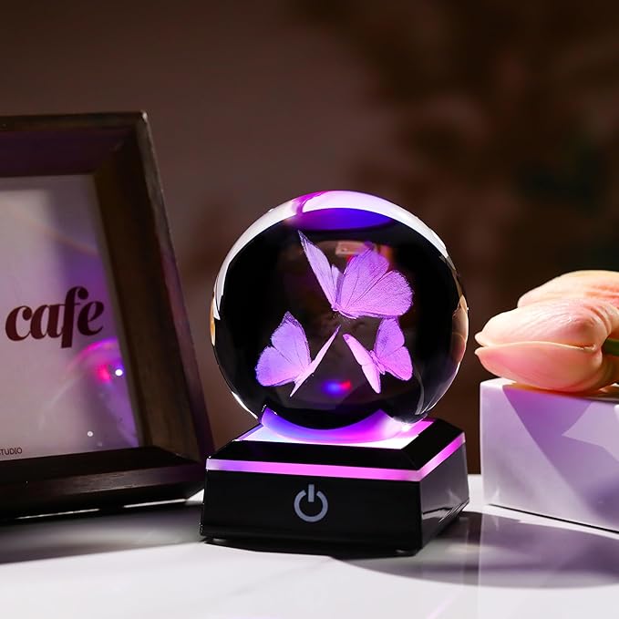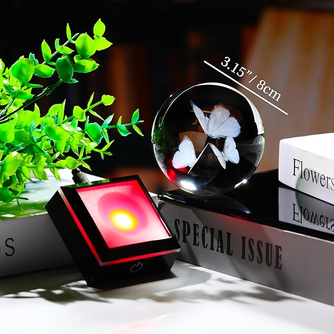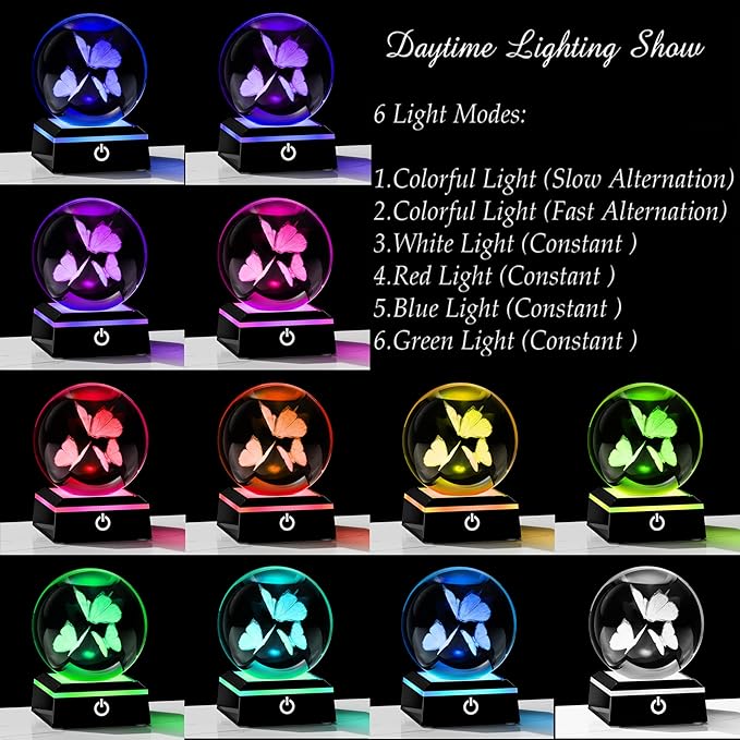 - 🍀Crystal Ball Butterfly Lamp- Crystal Glass Butterfly Night Light size: 3.14". Made of K9 Crystal, Interior images are carved by Advanced 3D Laser Engraving Technology.