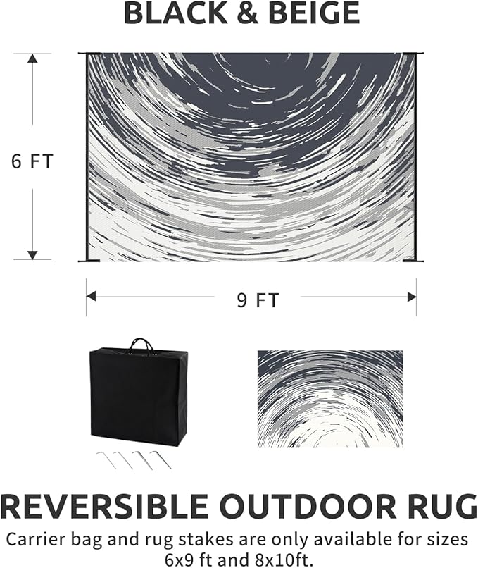 - RV traval&Camping: This camper must haves outdoor rug is ideal for picnics, gatherings, and RV trips! The lightweight outdoor camping carpet with foldable lines is easy to carry and saves space. Includes an extra carry bag and rug stakes for 6x9 ft, 8x10 ft and 9x12 ft. Grass-friendly, durable, and easy to clean, this outdoor rug enhances outdoor adventures.