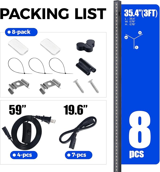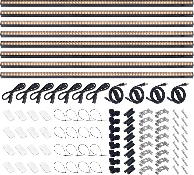 - What You Get: 8 x Barrina T5 Grow Lights, 4 x Power Cords with ON/OFF Switch, 7 x Connecting Cords (20''), 8 x Small Connectors, 16 x Installation Clips, 16 x Magnetic Bars with Double-Sided Tape, 24 x Cable Ties, 8 x Dustproof Cap