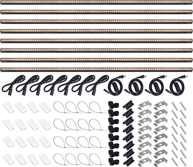 - What You Get: 8 x Barrina T5 Grow Lights, 4 x Power Cords with ON/OFF Switch, 7 x Connecting Cords (47.2''), 8 x Small Connectors, 16 x Installation Clips, 16 x Magnetic Bars with Double-Sided Tape, 24 x Cable Ties, 8 x Dustproof Cap