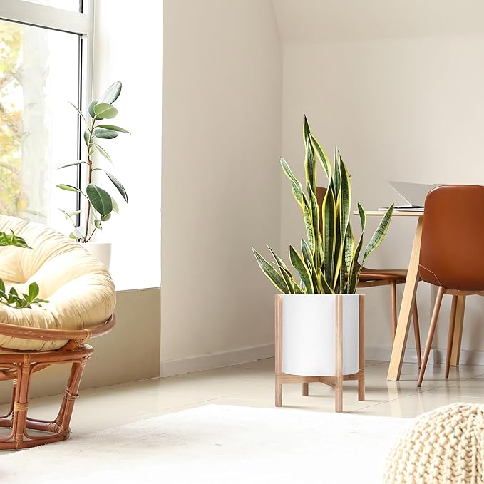 - A Complete Set: Minimalist plastic planter, combined with a sculptural, solid wood stand that match perfectly together and looks great in any home.