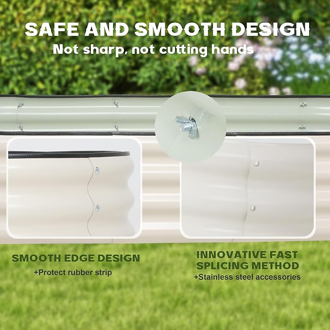 - Durable Material: This robust and durable planter box is constructed from high-quality galvanized steel, featuring a wall thickness of 0.6 millimeters.The surface is treated with an anti-rust coating, while the overlapping sections achieve a maximum thickness of 1.2 millimeters. For your convenience, the product includes a screwdriver and gloves.The black rubber sealing edge not only effectively prevents hand injuries but also enhances both the stability and aesthetic appeal of the flower bed