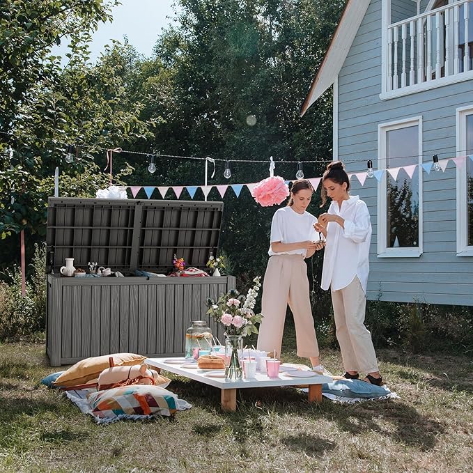 - BEAUTY MEETS DURABILITY: Featuring an aggregate resin with a wood grain pattern, this deck box offers an appealing look coupled with robust protection. It's resistant to water, UV rays, fading, rust, peeling, and warping, making maintenance nearly unnecessary for the coming years