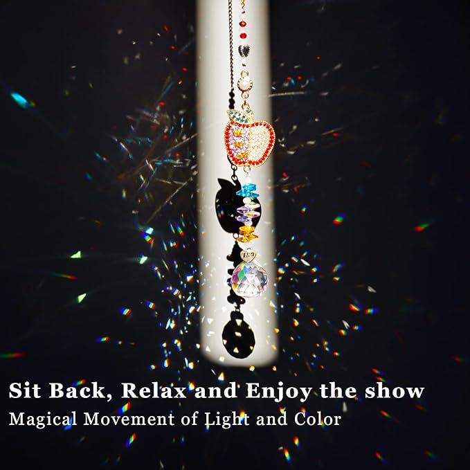 - Handmade Suncatcher: Our innovative designs consist of studded colored rhinestone apples, rainbow prisms and hanging chains. Each crystal suncatcher hangs from a delicate gold chain that casts specks and rainbows across your wall as it sways