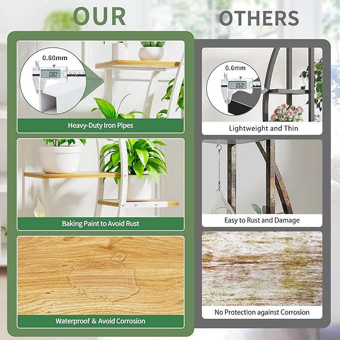 - 【High-Quality Material & Sturdiness】This plant holder is made with a sturdy 0.8mm thick iron pipe frame, with high-quality 15mm thick particleboard shelves, ensuring both durability and stability. The iron pipes are coated with special paint to prevent rust, while the shelves are treated with a water-resistant coating, allowing you to easily wipe away any water without damage.