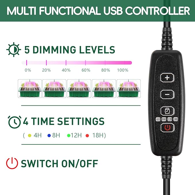 - [Improved intelligent control system] A seeding starter with 5 brightness levels of controllers that can adjust the brightness of the light to meet the light intensity requirements of different plants at different growth stages; The plant light timer has four modes (4h/8h/12h/18h), which can help you automatically control the lighting time. When you select one of the modes, it will automatically shut down at the specified time.