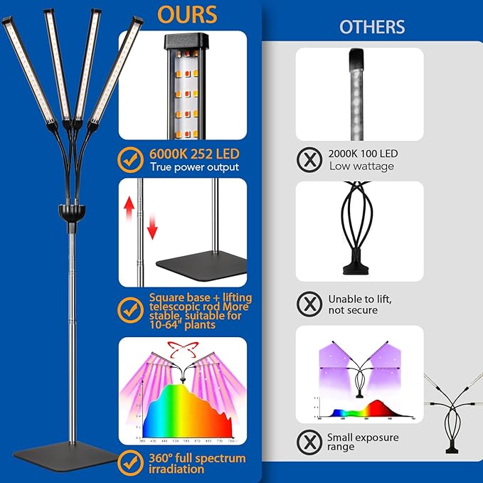 - 【grow light with Adjustable Altitude】Grow lights for indoor plants with Equipped with a stable and durable square base and adjustable height lifting rod. Adjustable in the 10 to 16 inch range, suitable for more houseplants of different sizes. Widely used for home balconies, indoor desktops, gardening, sowing/breeding, plant growth, potted plants, small and large plants.