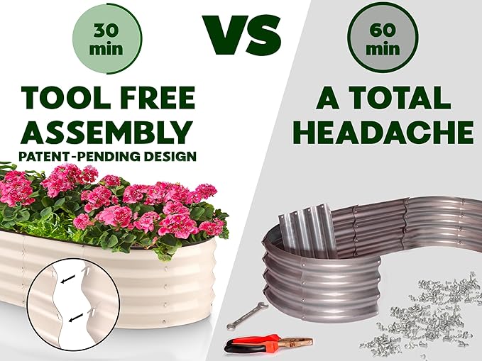 - EFFORTLESS ASSEMBLY, LIKE NO OTHER! Begin your planting journey by choosing our innovative patented design, featuring the perfect combination of easy assembly and durability. Thanks to our unique tool-free design, assembly is a breeze and can be completed in just 30 minutes! Get started on your garden right away and enjoy fresh, healthy produce in no time.