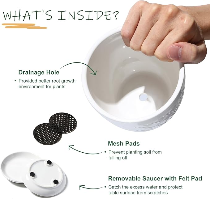 - Ceramic Plant Pots with Drainage Hole: Each small plant pot measures 3.5''W*2.8''H , which is the ideal for growing small and medium sized plants, such as succulents, snake plants, cactus, orchid and small flower. The flower pots has a central drainage hole and saucer to ensure adequate drainage and ventilation to avoid root rot, and include a 1.7 inch diameter mesh to prevent soil from falling out