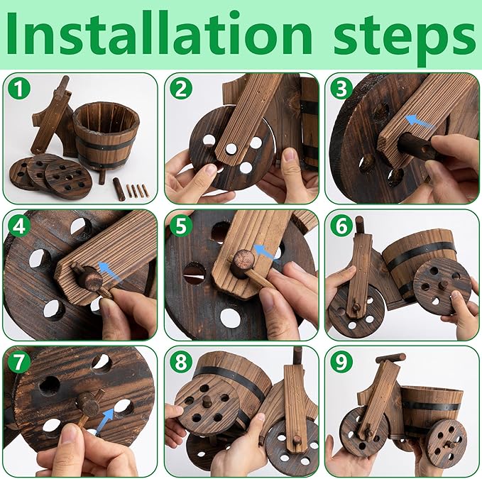 - Prefect size:Each wooden raised tricycle planter is 9.5 inches high, 11.5 inches long and 8 inches wide, lovely size for indoor and outdoor decoration; the bucket is 6.5 inches in diameter and 4.5 inches deep for you to grow your favorite plants.