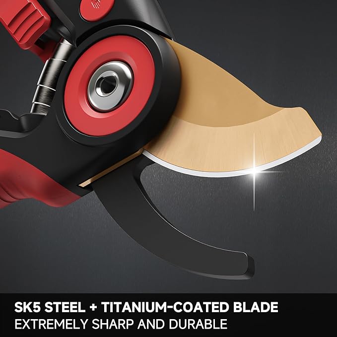 - 【Premium SK5 Steel with Titanium Coating】 Made from Japanese SK5 high-carbon steel, heat treated for durability. The titanium coating resists rust, corrosion, and wear, keeping blades sharper for longer and delivering clean cuts that promote faster plant healing.