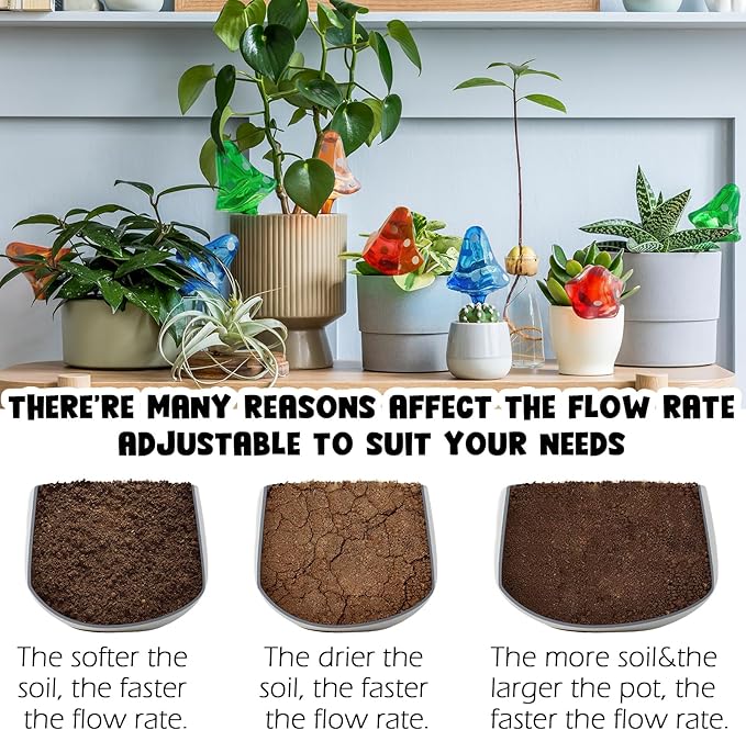 - 🌻PLANT WATERING SPIKES WHILE AWAY:No more worries about your plants when you're on vacation,traveling,business trip,any scenario where you need to leave the house. You can adjust the number of mushrooms placed,the angle of tilt,etc depending on how long you are away from home. Suitable for different plants. Like bonsa,pot plants,hanging plant,any outdoor&indoor plants.