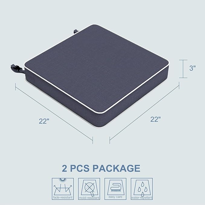 - PACKAGING: Includes 2-Pack outdoor chair cushions 22" x 22" x 3", perfect for patio chairs, garden sofas and more. Due to the vacuum compressed status, please allow 48 hours to restore thickness after opening the package