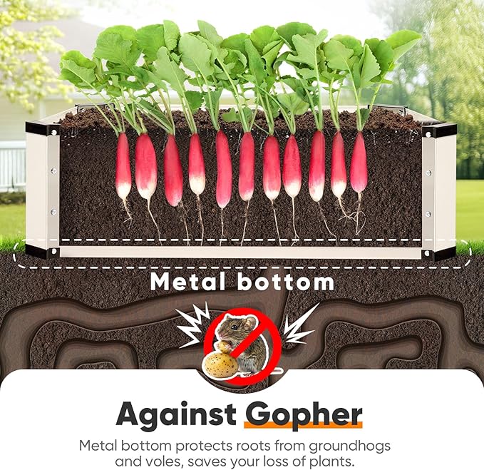 - 【No More Vole-Ravaged Crops!】Say goodbye to stolen harvests! Standard raised garden bed kits leave roots exposed to burrowing animal, but our galvanized steel-lined base acts as a 24/7 rodent barrier. No DIY wire mesh needed - just assemble and plant. Ideal for organic vegetable enthusiasts in rural/suburban areas where voles there destroy a large amount of crops every year. Protect your heirloom carrots and beetroots effortlessly!